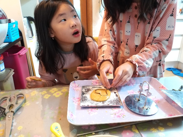 그리고 소소한 팁이라면 이렇게 달고나를 붓고 바로 모양틀을 찍으면 달고나가 모양틀에 많이 묻습니다.
